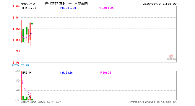 3月10日,截止午间收盘,光伏ETF博时(560310)跌0.19%,报1.027元,成交额574.48万元。光伏ETF博时(560310)重仓股方面,特变电工截止午盘跌1.95%,隆基绿能跌0.76%,TCL科技涨1.47%,阳光电源涨0.22%,迈为股份涨1.38%,罗博特科涨5.68%,捷佳伟创跌0.48%,德业股份跌3.41%,正泰电器涨3.71%。